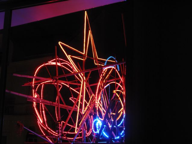 'unsicheres terrain (on a shaky ground)', 2012, bamboo, cable-light, electrical material, dim. ca 20 x 4 x 4 m courtesy Galerie Mark Müller, Zürich, Goethe-Institut, Budapest